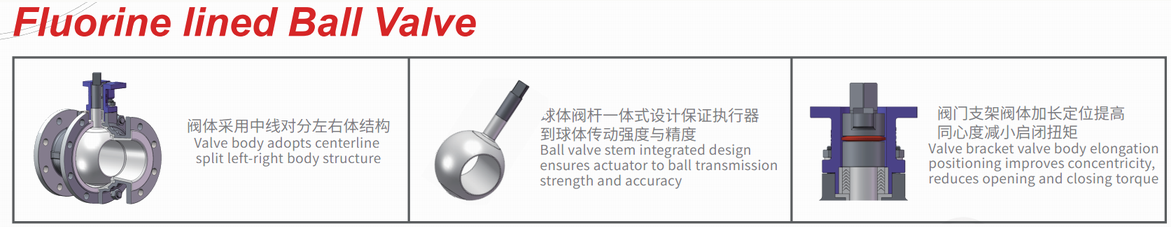 The medium flowing through the inner wall of the fluorine-lined ball valve adopts the corrosion-resistant polytetrafluoroethylene(PTFE/PFA) lining process to prevent strong corrosive media fromcontacting with metal, causing metal corrosion and damage. It iswidely used in chemical, pharmaceutical, biological and other fields.