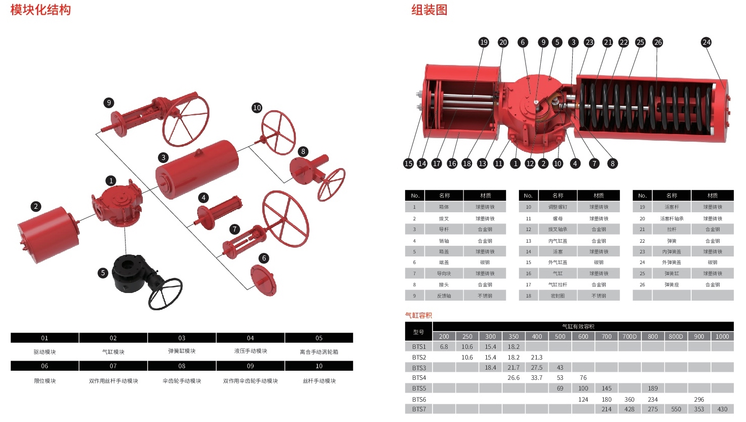 BTS系列氣動執行器可拆分為驅動模塊、氣缸模塊、彈簧缸模塊、手動裝置等獨立模塊,根據客戶個性化需求進行安裝、維修。