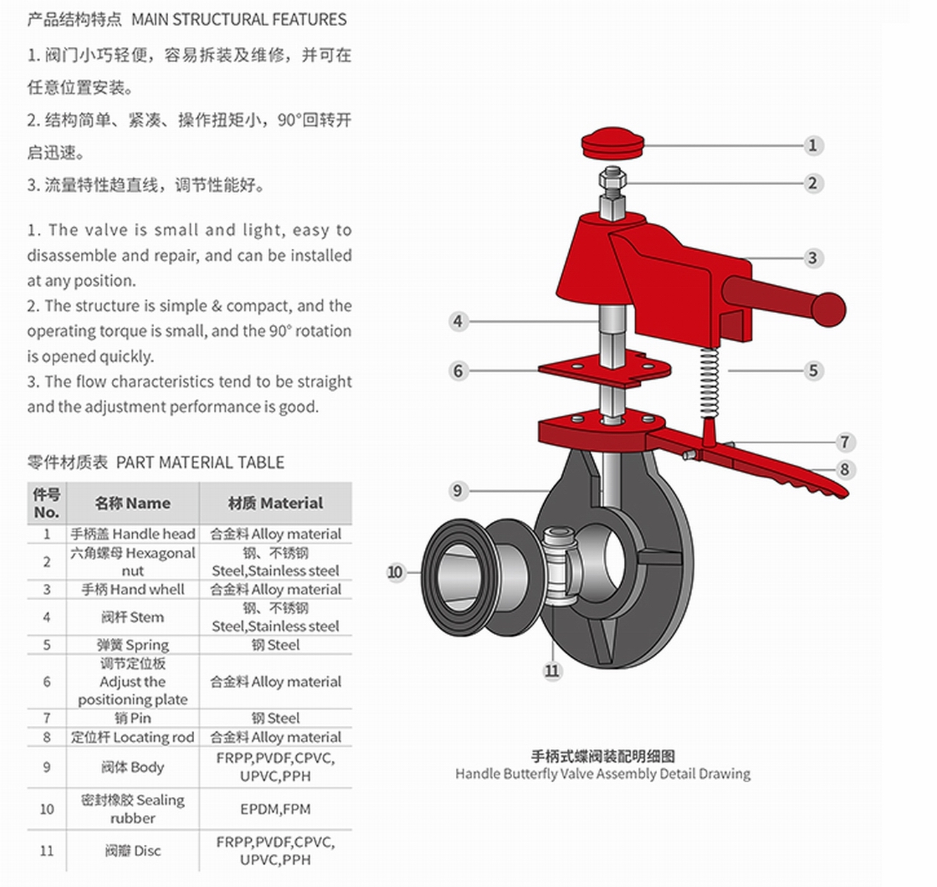 進口塑料蝶閥,閥體材質應以PPH、RPP、PE、PVDF、CPVC、UPVC原料制成,密封座采用三元乙丙橡膠(EPDM)或氟橡膠(FPM)制成。