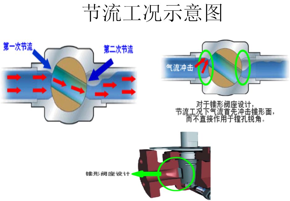 對(duì)于錐形閥座設(shè)計(jì)的旋塞閥,節(jié)流工況下氣體流入閥芯時(shí),氣流首先沖擊它前面錐形閥座的錐面,通過(guò)錐面的導(dǎo)向作用該表方向后進(jìn)入閥芯,而不是直接沖擊閥芯鏜孔的銳角,加之閥芯可以根據(jù)節(jié)流工況設(shè)計(jì)多樣的流動(dòng)面、形狀和功能所以旋塞閥可以用于節(jié)流工況。